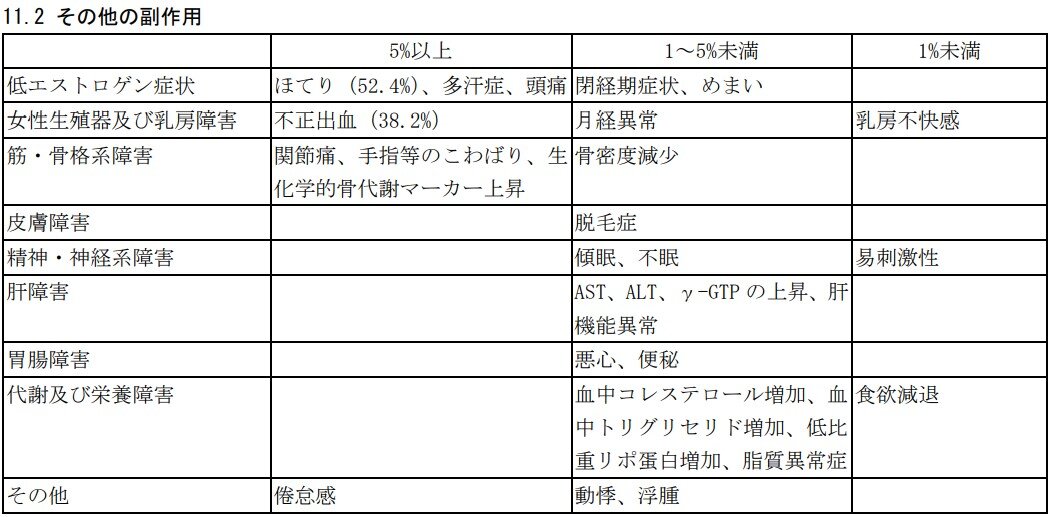 エストロゲン低下作用に基づく更年期障害様のうつ状態があらわれることがあります。また、その他の副作用は、以下のとおりです。