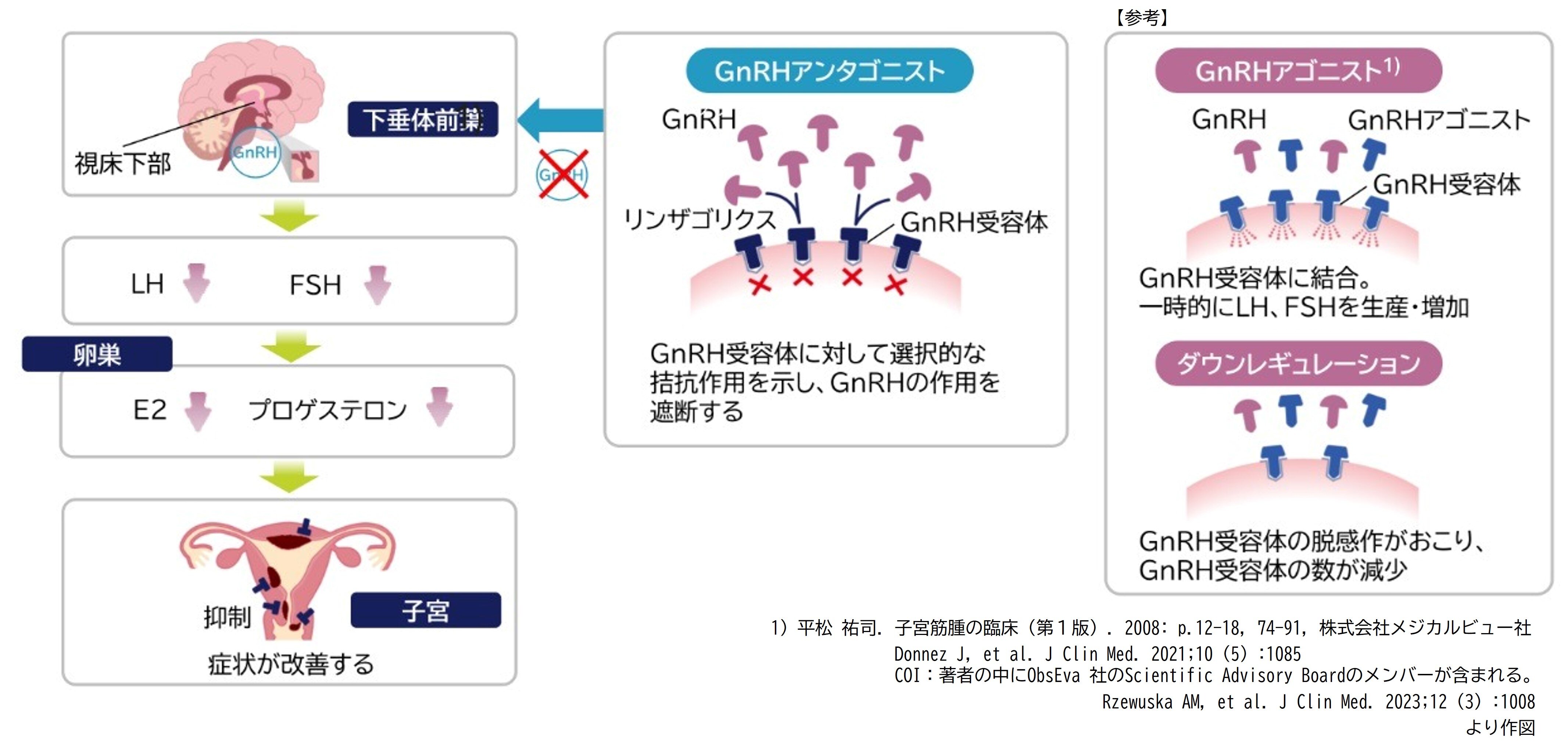 リンザゴリクスは下垂体前葉に発現しているGnRH受容体に対して選択的な拮抗作用を示し、GnRHの作用を遮断します。それにより、下垂体からの性腺刺激ホルモン(LH及びFSH)分泌を阻害し、卵巣からの性ホルモン(E2、プロゲステロン等)分泌を阻害します。