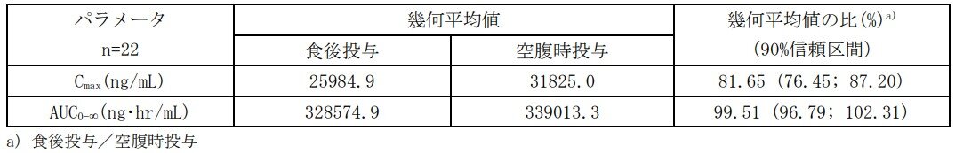 以下の試験結果より、イセルティ錠は、食事の影響を受けません。