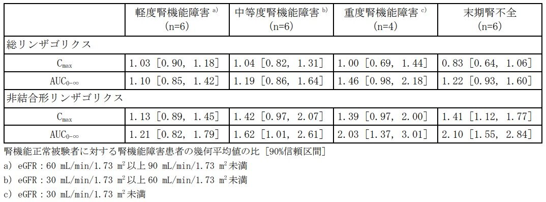 中等度の腎障害のある患者では、非結合形リンザゴリクスの血中濃度が上昇し、副作用が強くあらわれるおそれがあります。