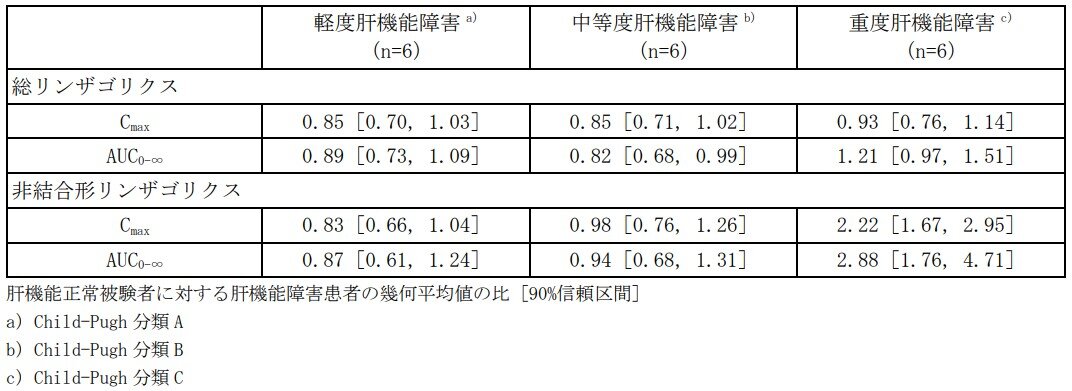 軽度、中等度及び重度の肝機能障害患者並びに肝機能正常被験者にイセルティ錠200mgを単回経口投与したとき、肝機能障害の程度がリンザゴリクスの薬物動態に及ぼす影響は以下のとおりでした(外国人データ)。